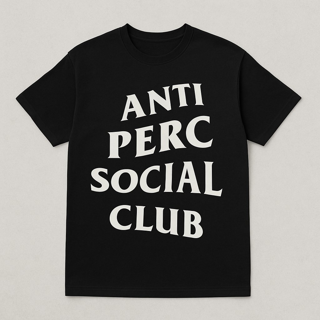 BLACK SHIRT WITH WHITE LETTERING (ANTI PERC SOCIAL CLUB)